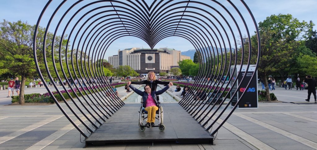 ПС: Приятен спомен е направата на тази снимка – даваш си телефона на случаен наблизо намиращ се човек, за да е фотограф. След секунди сме се качили и позирахме като манекенки с една инвалидна количка. А фотографът случайно беше чужденец. Няма нищо случайно. 🙂