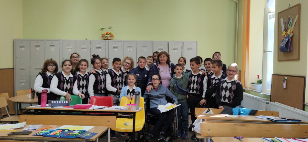 Още една разлика между сега и едно време е инвалидната количка. Учениците бяха седнали на чиновете си и реших да се “разходя” между първите две колони с чинове. Наблюдавах как рисуват или оцветяват. 🙂 А когато дойде време да мина между втората и третата колони с чинове, не остана време, за да помисля, че няма как да стане. Отне около секунда и половина, учениците дружно преместиха чиновете си и така количката спокойно да се “разходи”. Благодаря!
