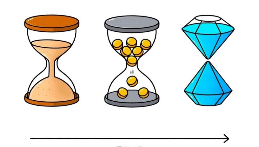 Времето променя стойността и цената на съдържащото се в часовника. Със сигурност, пясъкът не се смята за екстремно стойностен продукт, затова се дава на децата… 🙂 Възможностите са безкрайни и се нуждаят от “монетите” във втория часовник. Времето си знае работата и всичко идва на мястото си в правилния момент. (Не знам дали диамантите и инвалидната количка имат нужда от коментар, изобщо не са съвместими засега. Млада се чувствам.)