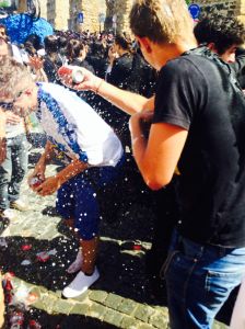Шествието тръгна, ние се позиционирахме на стратегическо място с чудесна гледка. Имаше оркестранти, имаше музика и всичко беше много цветно. Камионите е движеха много бавно, за да успяват студентите в тях да дават бира на всеки, който си протегне ръката нагоре. Когато видях няколко от Еразъм студентите с бира в ръцете разбрах, че трябва да се отдалеча. Усетих как някой излива бира във врата ми. Изпищях! Но беше достатъчно шумно, за да не чуе никой. Не харесвам миризмата на бира, особено по дрехите си. Нали си бяхме обещали нещо… И тогава още бира, този път по косата ми. И се започна! Прибрах фотоапарата, отидох до поредния камион за бира и поливах когото видя.